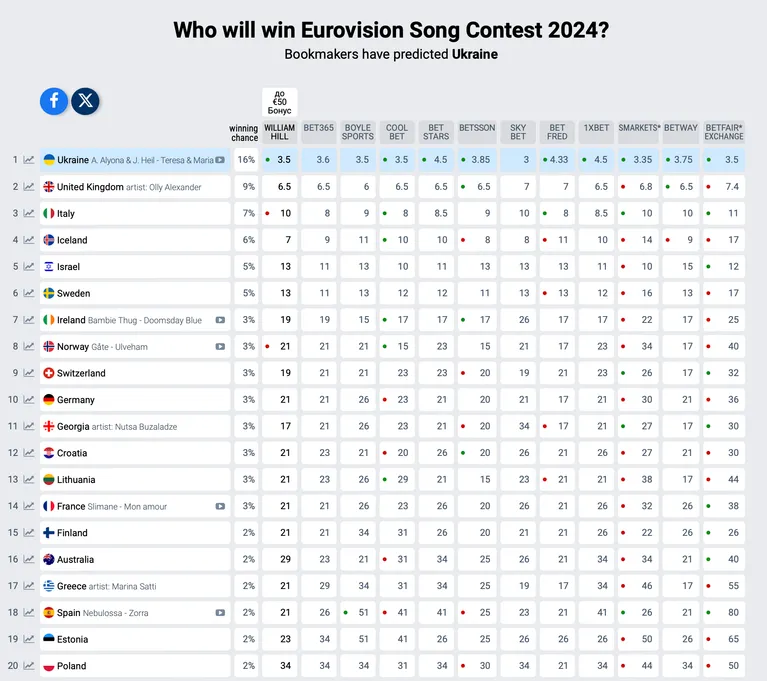 Звернімо увагу, що у цій таблиці – зведення прогнозів букмекерських контор. Вони стосуються того, яка держава має шанси здобути перемогу на Євробаченні-2024.